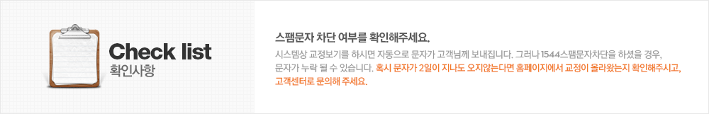 스팸문자 차단 여부를 확인해주세요. 시스템상 교정보기를 하시면 자동으로 문자가 고객님께 보내집니다. 그러나 1544스팸문자차단을 하셨을 경우, 문자가 누락 될 수 있습니다. 혹시 문자가 2일이 지나도 오지않는다면 홈페이지에서 교정이 올라왔는지 확인해주시고, 고객센터로 문의해 주세요.
